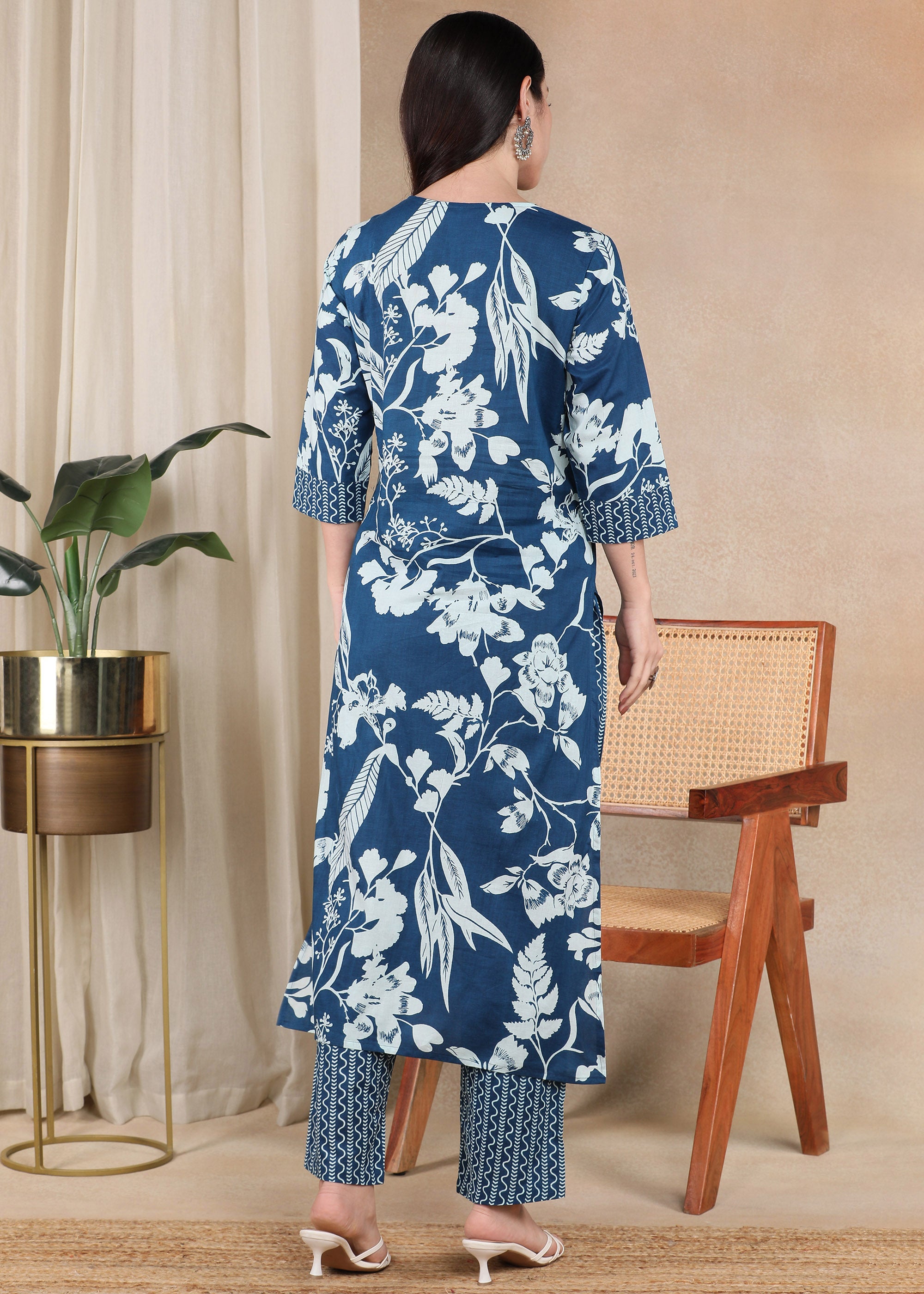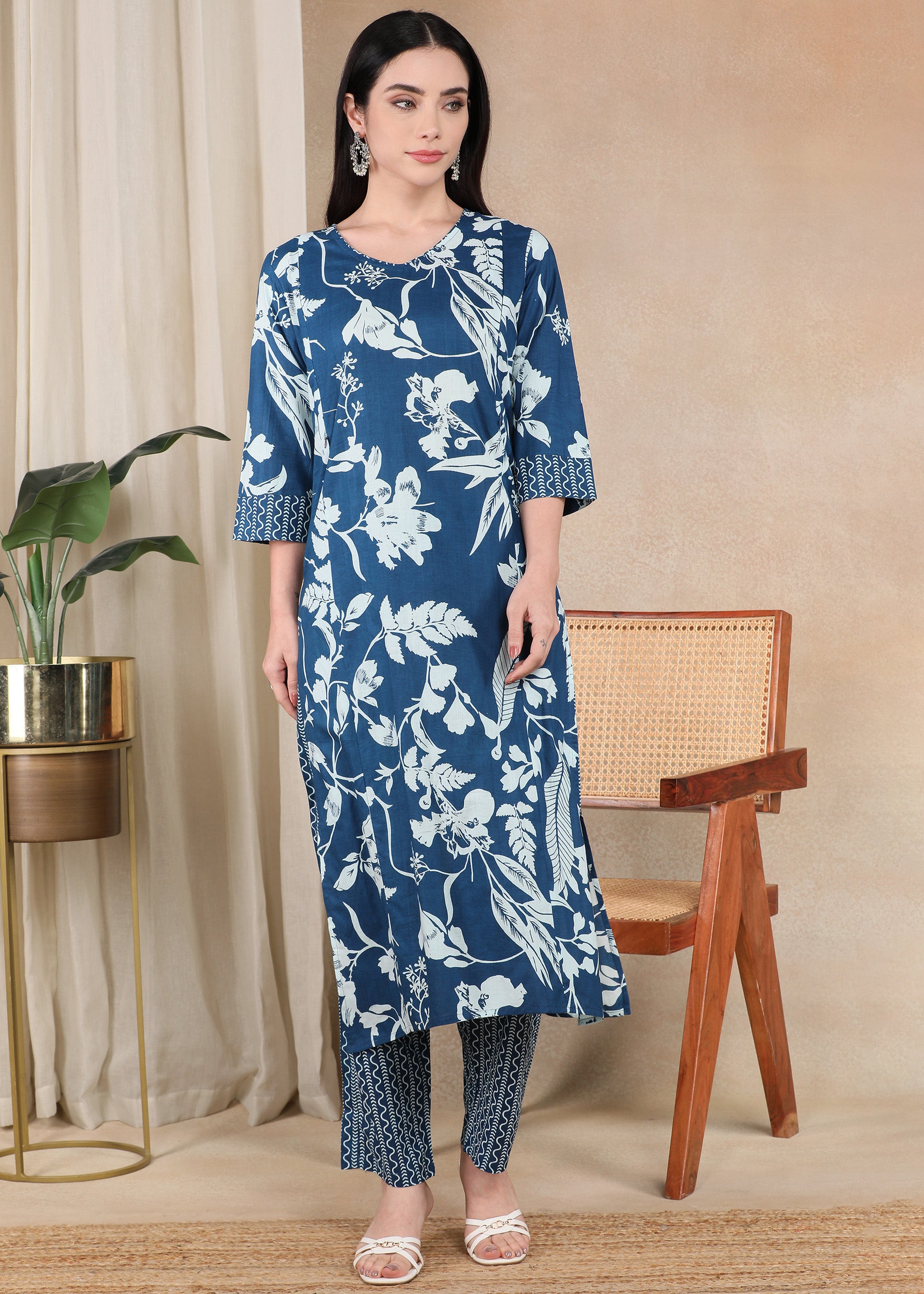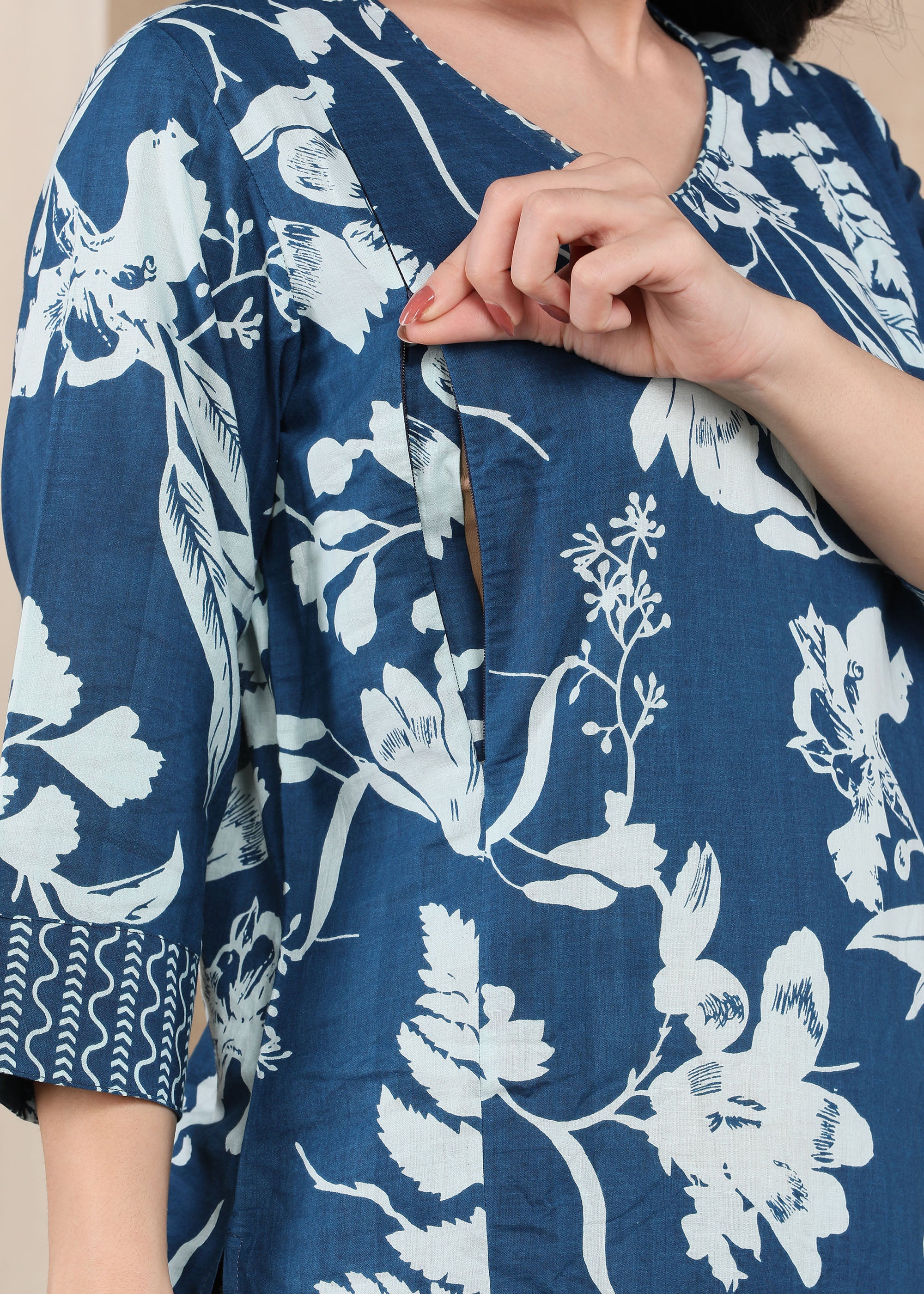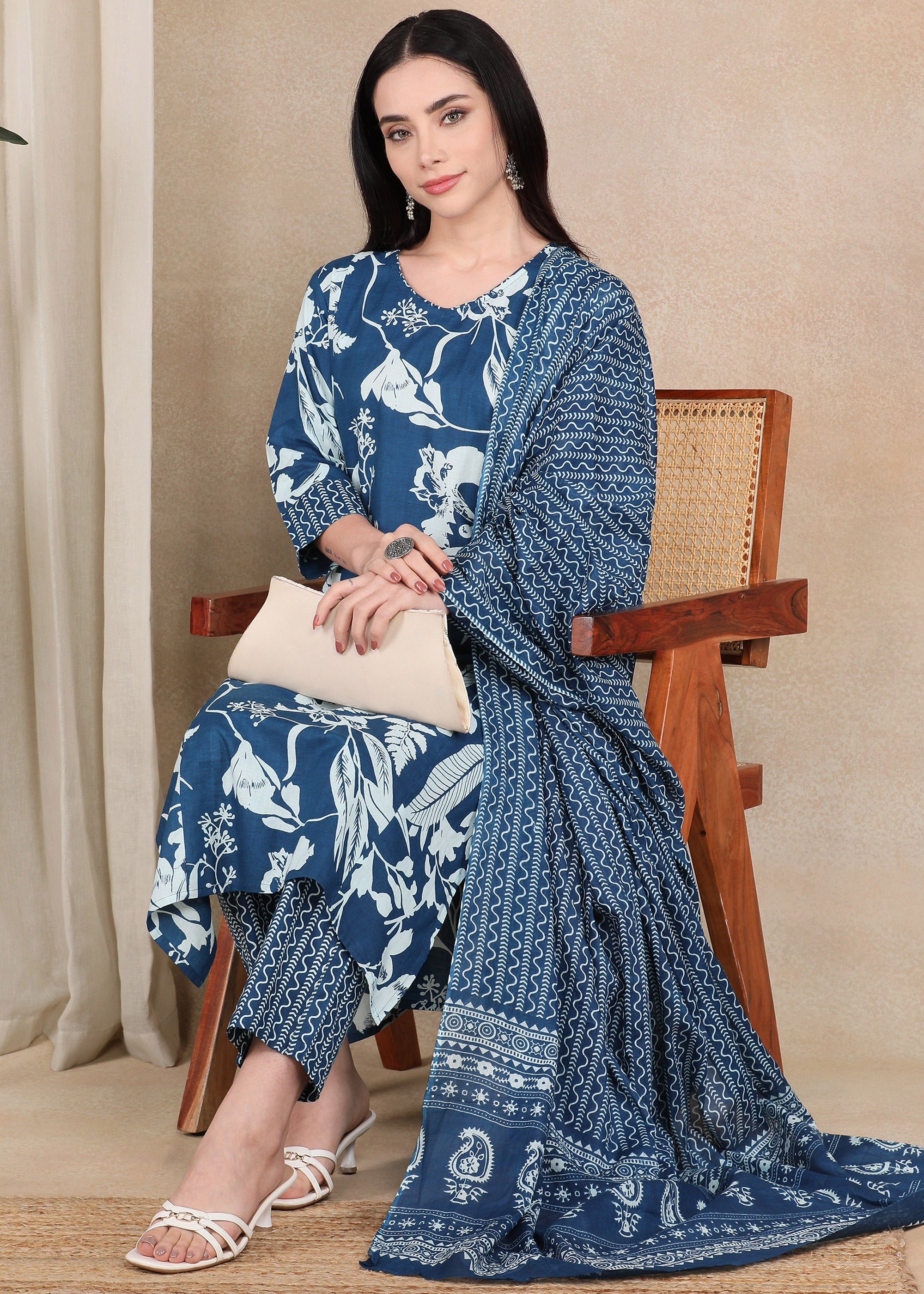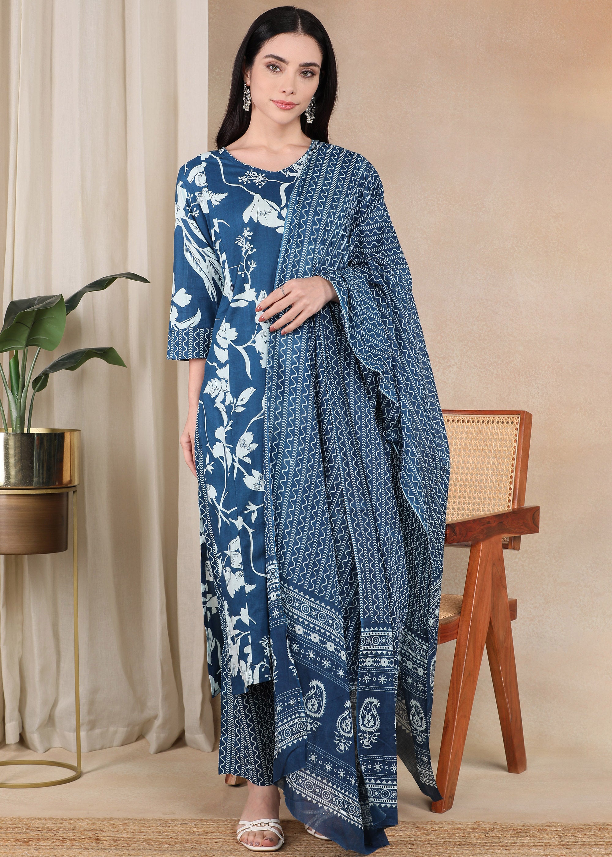 Blue Pure Cotton Straight Feeding Kurta Set with Dupatta