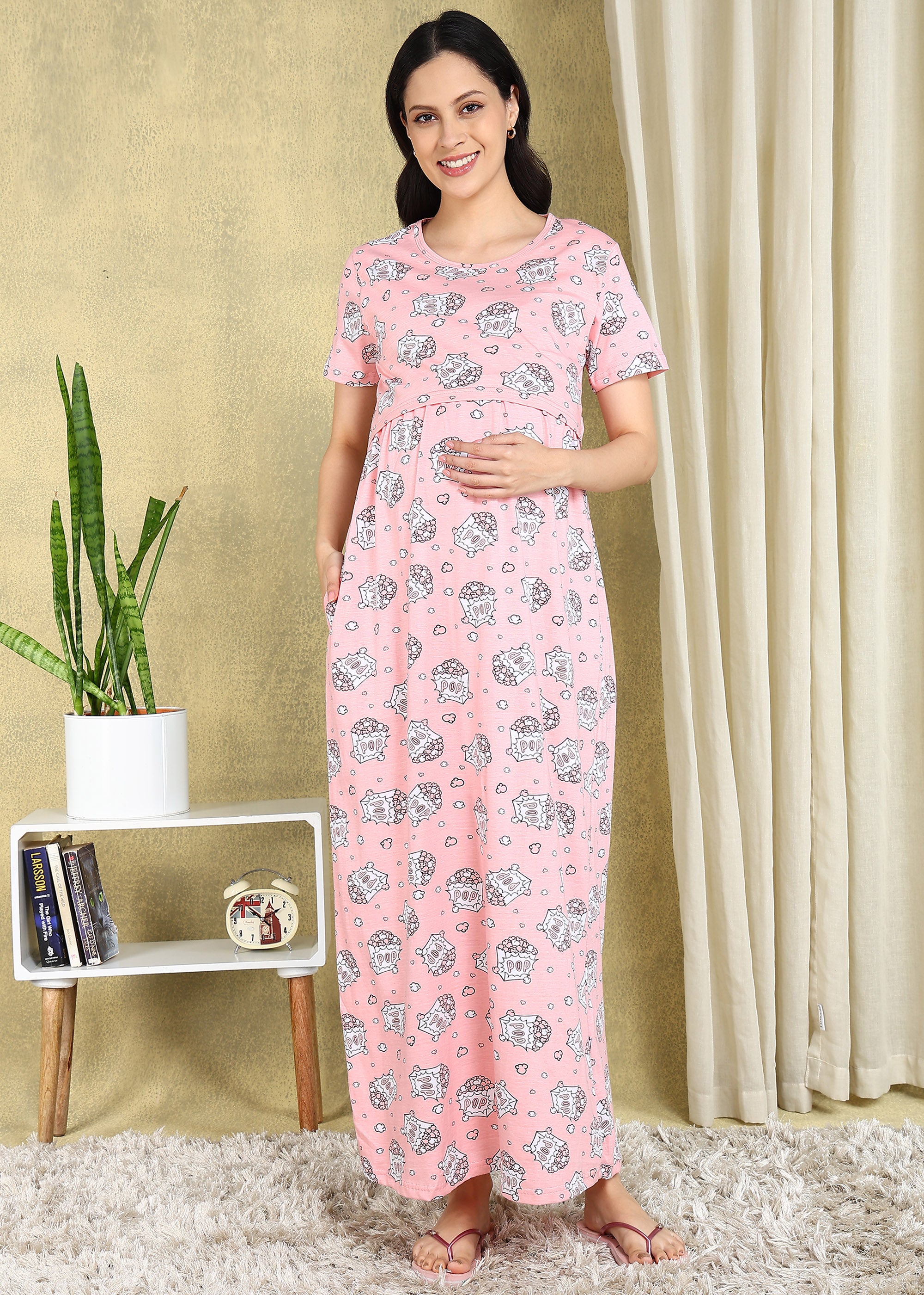 Popcorn Pink Cross-neck Maternity Loungewear Maxi Dress