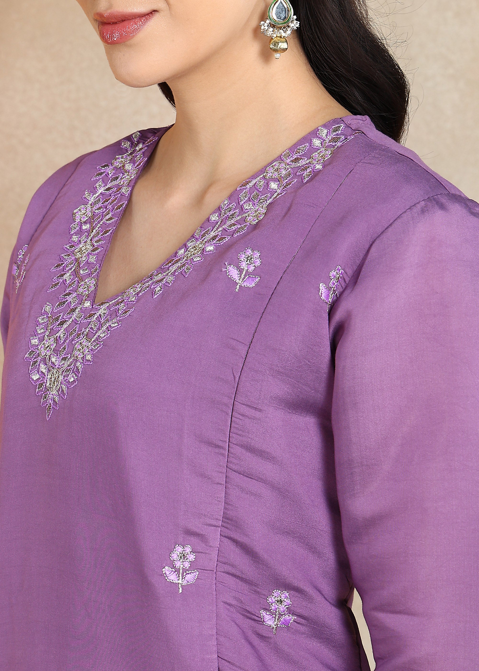 Elevate your style with our Dupion Silk Kurta Set with a contrast Banarasi silk dupatta and hidden 9-inch concealed zips for easy breastfeeding.