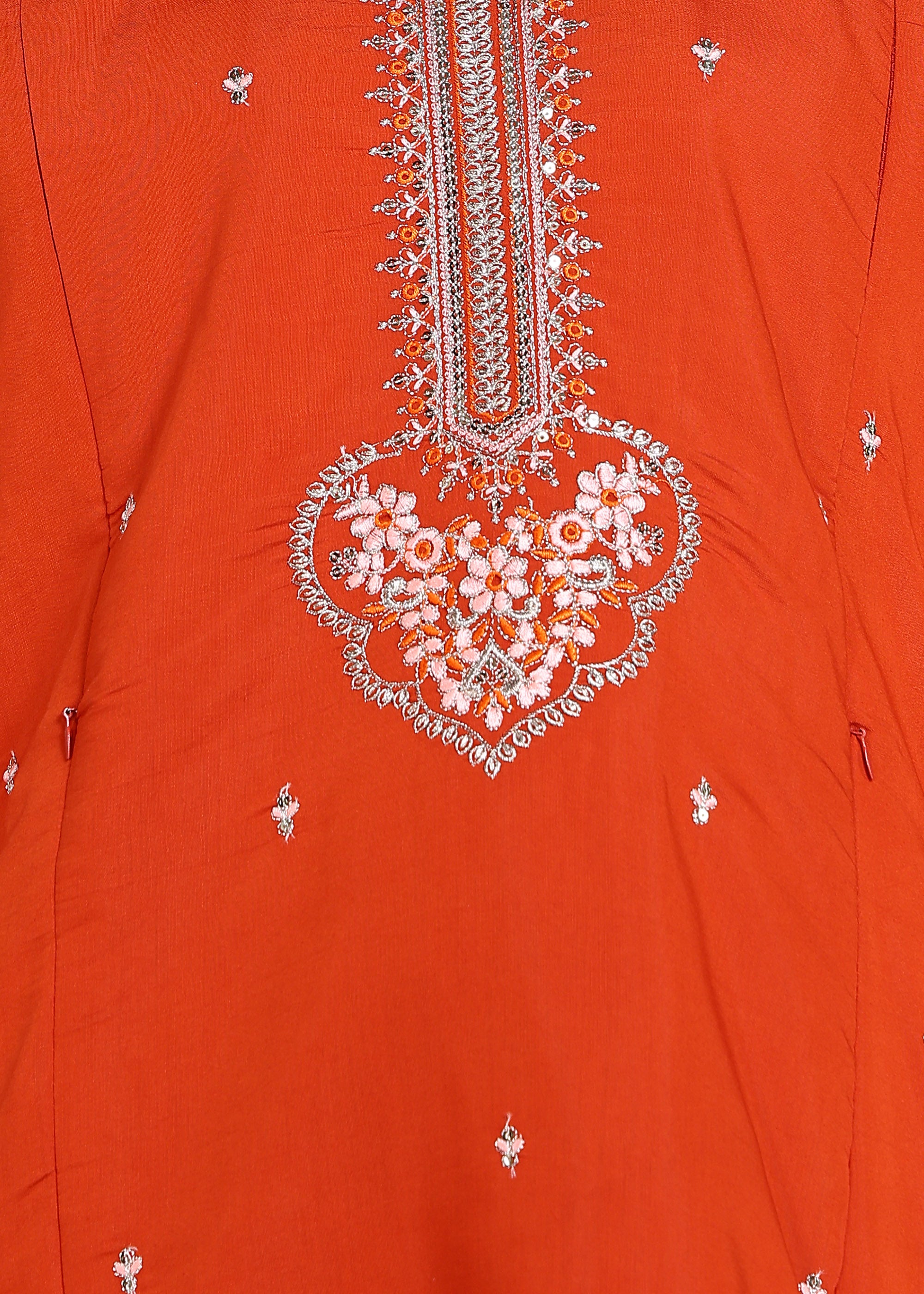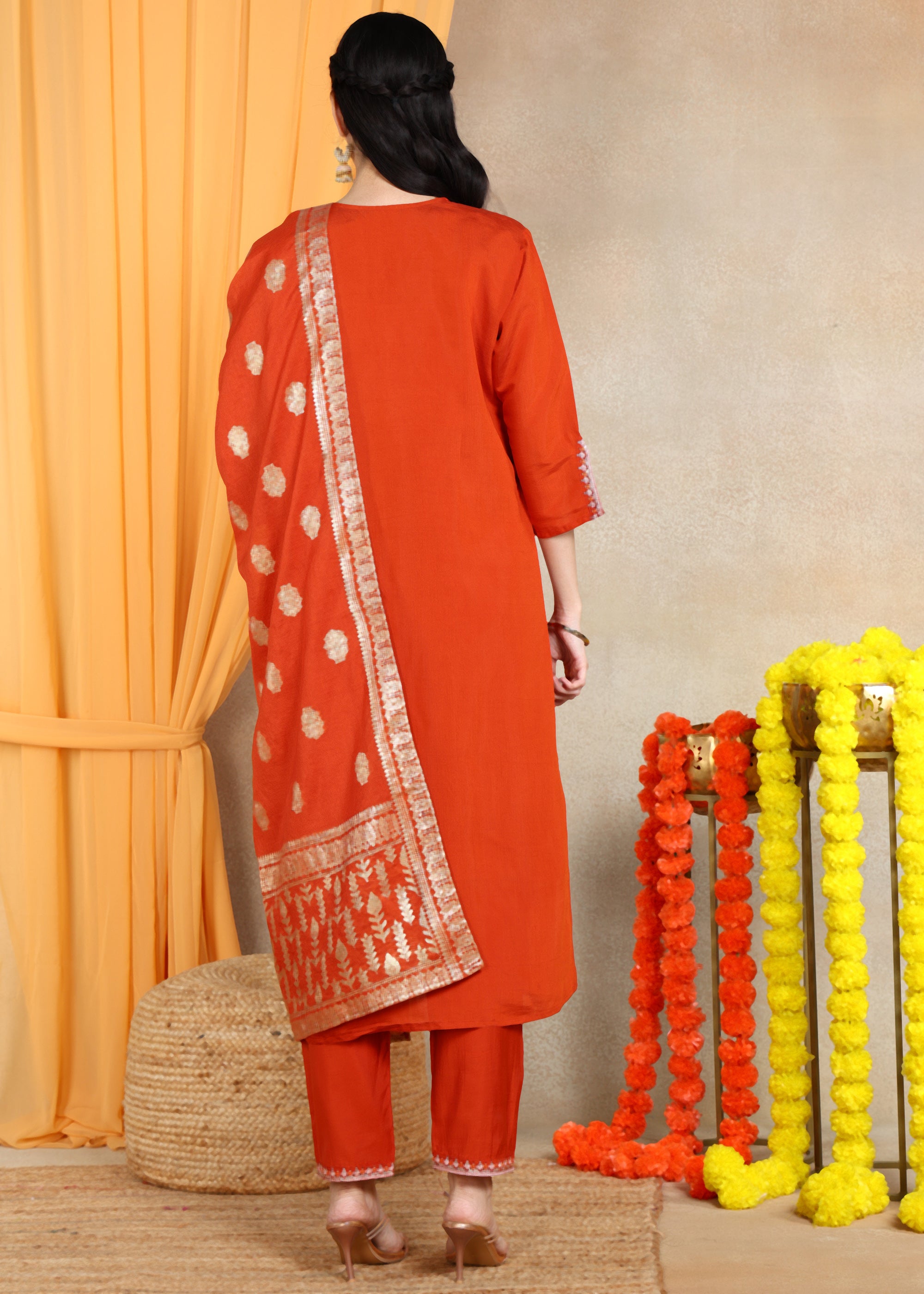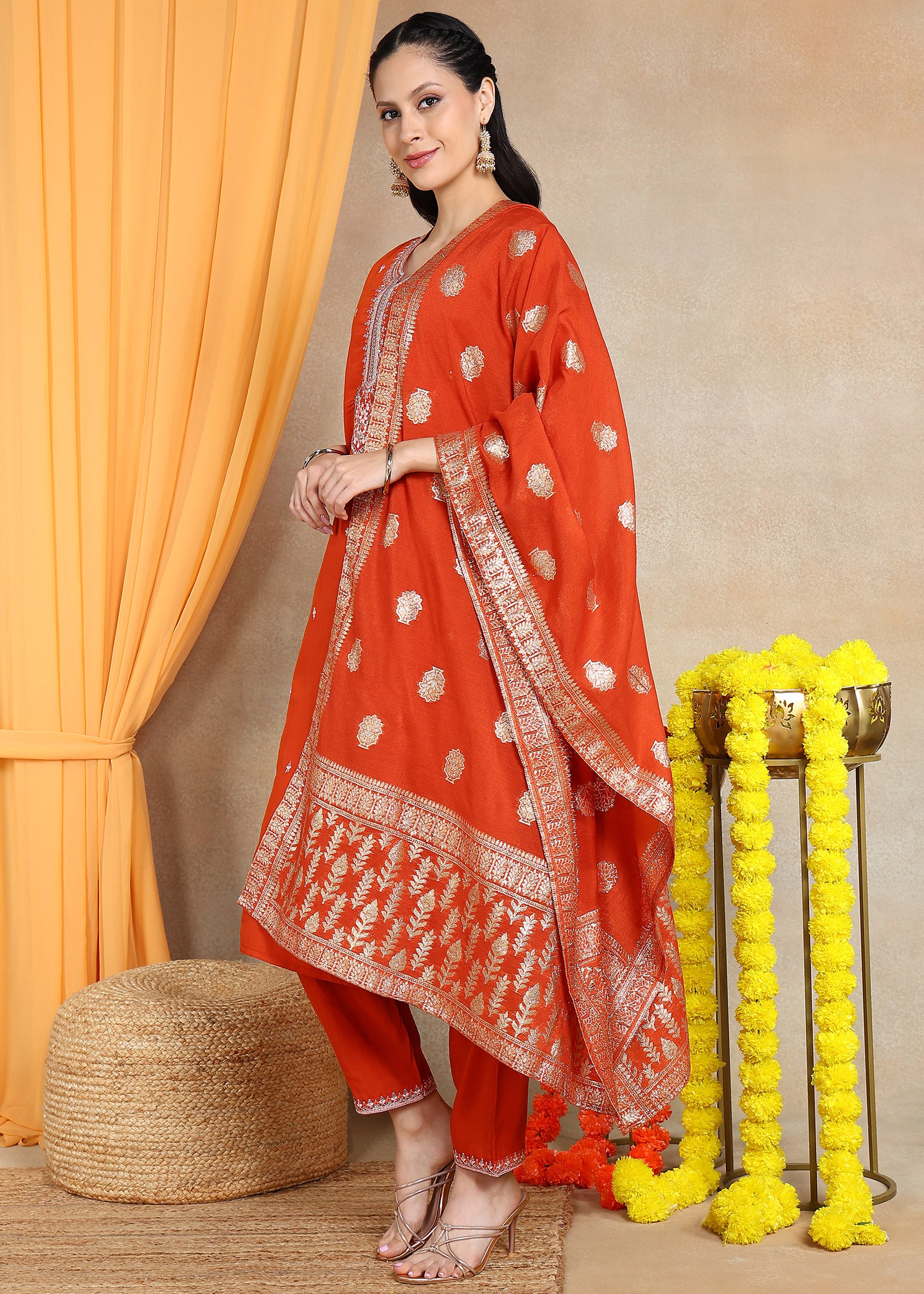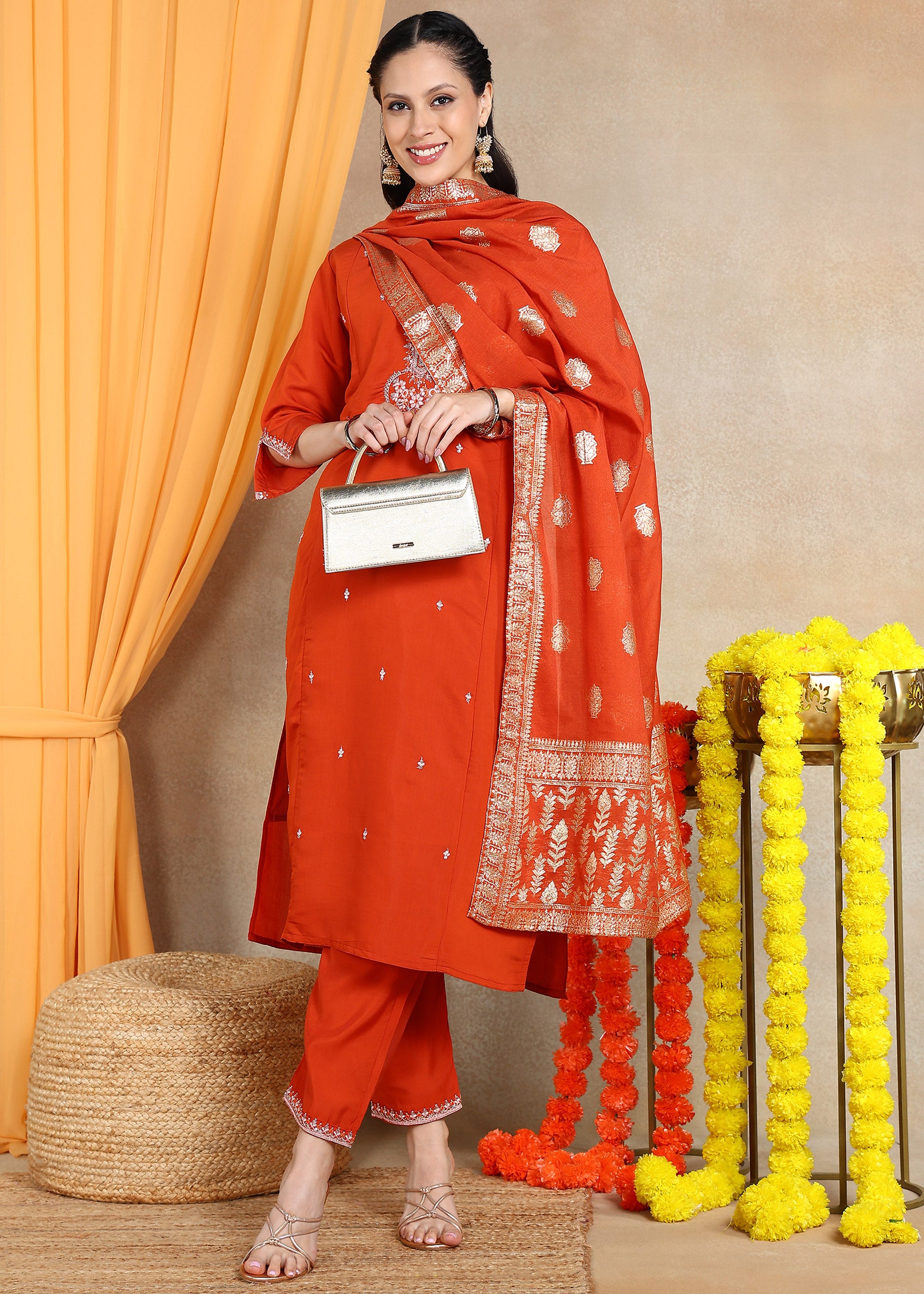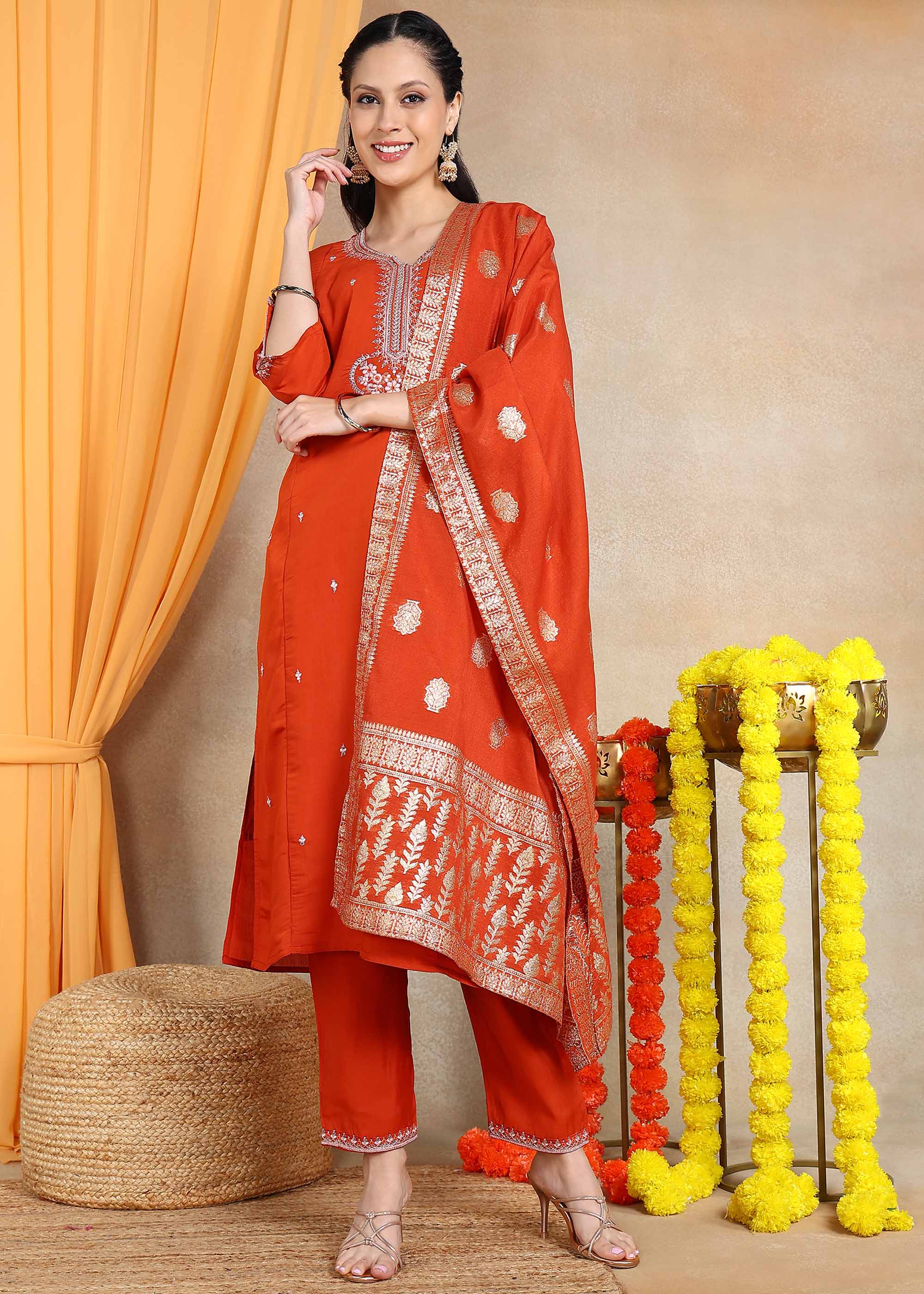 Rust Orange Festive Straight Feeding Kurta Set with Dupatta