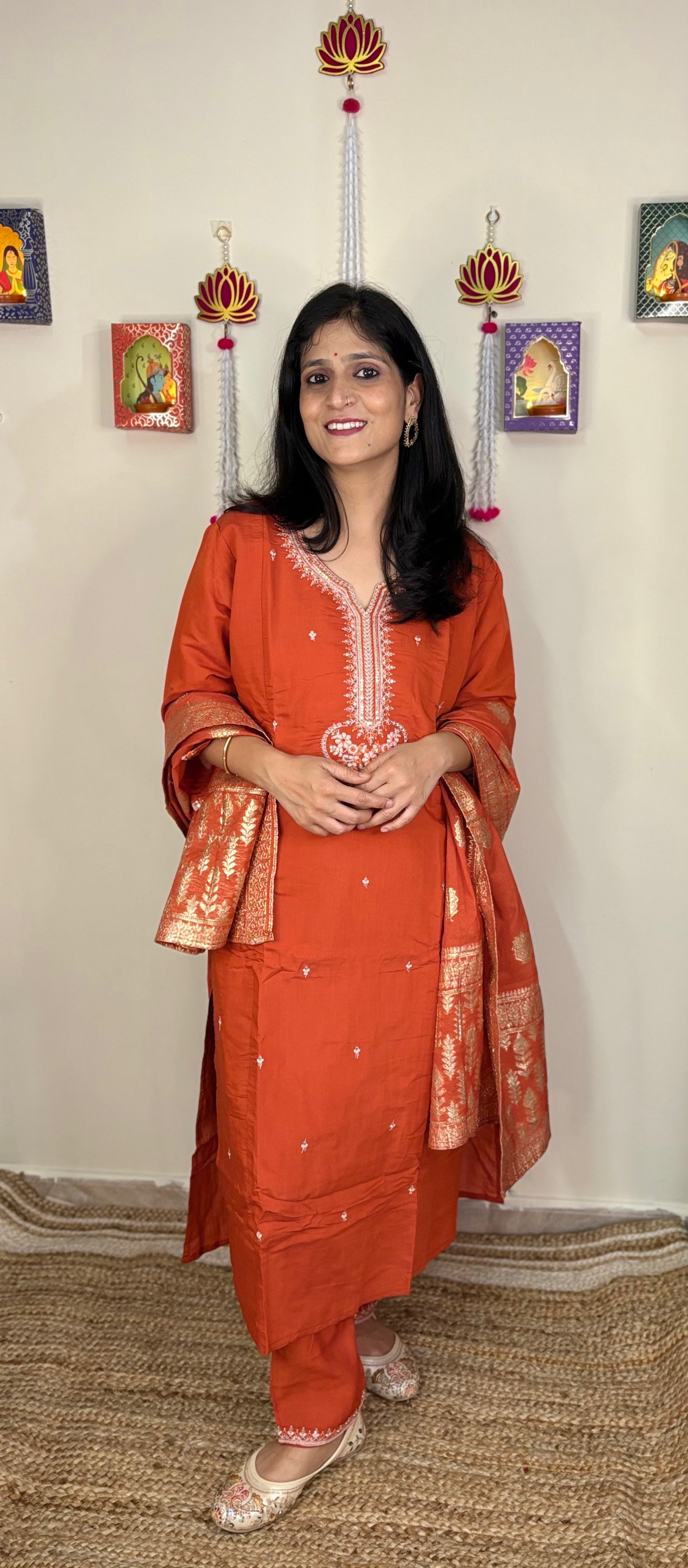 Elevate your style with our Dupion Silk Kurta Set with a contrast Banarasi silk dupatta and hidden 9-inch concealed zips for easy breastfeeding.